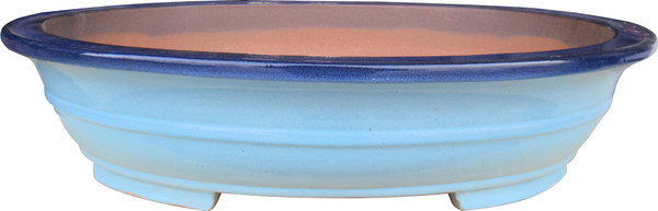 21" Gradient Light Blue Glazed Oval Bonsai Pot with a lightly flared lip. This unique pot has two belts belt, with a lightly flared lip that has a small indent belt sitting on top of block feet and is high fired stoneware.